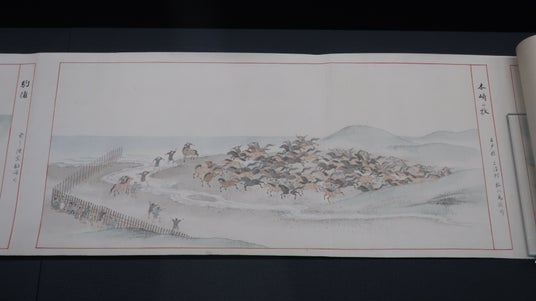 安政3年(1856)に15代藩主 南部利剛が盛岡藩北部の海岸を視察した際、巡見地の名所15ヶ所を随行した盛岡藩士 中村伊代治に描かせたもの。そのうち、利剛自身も木崎野で見学した、馬を追い込んで捕獲する「二歳駒野取」の様子も描かれる。野取を見物する人々が描かれていることから、「野取」という馬産業特有の行事が盛岡藩の風物詩となっていたことが窺われる。