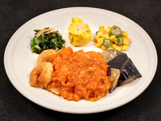 副菜にも海老をふんだんに使用しており、桜海老入りの青梗菜のあえ物、プリプリ食感のえび焼売、エビ油が香るコーンとオクラのごまだれです。