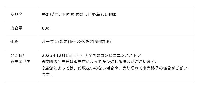 カルビー株式会社(本社:東京都千代田区、代表取締役社長兼CEO: 江原 信)は、“噛むほどうまい!”堅い食感が人気のポテトチップス「堅あげポテト」から、贅沢な和の味わいを追求した「匠味(たくみ)」シリーズの『堅あげポテト匠味 香ばし伊勢海老しお味』を2025年12月1日(月)から全国のコンビニエンスストアで期間限定発売します(2026年1月中旬終売予定)。