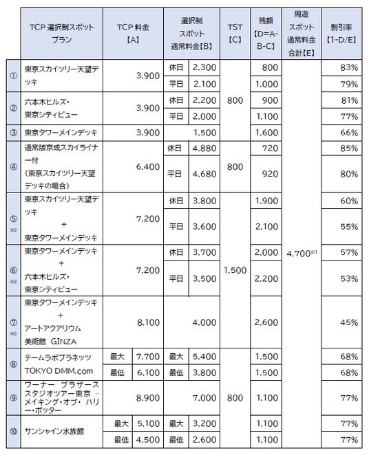 ※1 RED° TOKYO TOWER2,300円、東京ドームシティ アトラクションズ1,000円、寿湯1,000円、浅草寺200円、つきじ丸武200円の合計です。