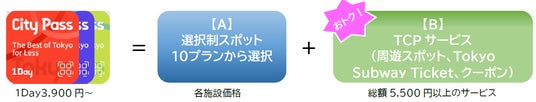 「Tokyo City Pass」は、メインとなる観光施設を選択いただく【A】選択制スポットと、総額5,500円分以上の【B】TCPサービスをセットにして、最低3,900円からご利用いただけるおトクな観光チケットです。
