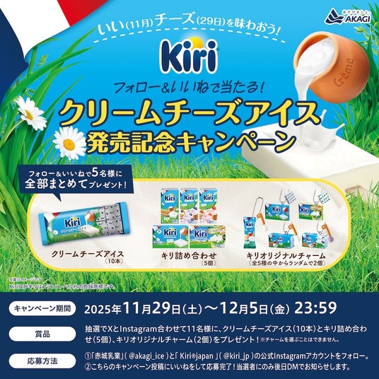 また発売を記念し、2025年11月29日(土)「いい(11)チーズ(29)」にあわせて、豪華賞品が当たるキャンペーンを「キリ」と赤城乳業の公式X、公式Instagramで実施いたします。