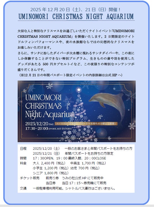 海と人、水と人との、新しい「つながり」をうみだす水族館『仙台うみの杜水族館』では、2025年11月28日(金)~12月25日(木)の期間、クリスマスイベント「UMINOMORI CHRISTMAS」を開催いたします。