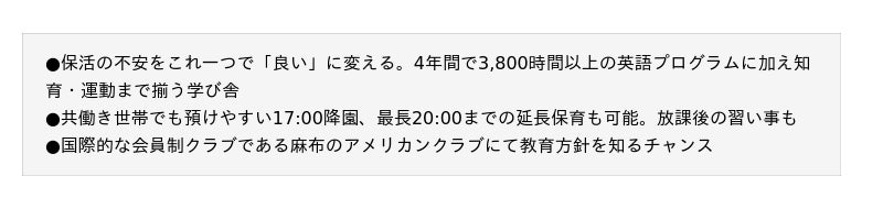 ・英語はもちろん、運動、知育をバランスよく伸ばせる点がとてもよく、子どもを安心して預けられると感じています。私が通いたかったくらいです。