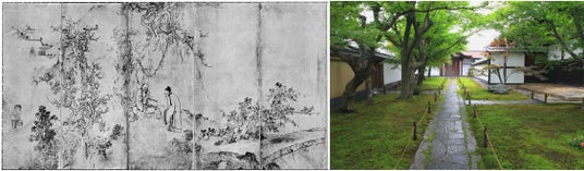 左写真:壬生寺 【重要文化財】長谷川等伯筆「列仙図屏風」(右隻) 右写真:大徳寺 黄梅院 前庭