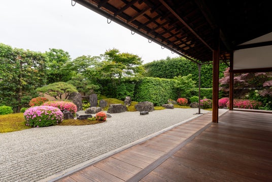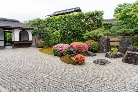 室町期の建築様式の特徴を見せる本堂(重要文化財)や唐門を持つ大徳寺興臨院。桃山期には豊臣政権の五大老を務めた前田利家が本堂屋根を修復、また菩提寺とするなど前田家とも非常に縁の深い寺院です。優美で安定感のある姿が静寂と落ち着きを感じさせる本堂や、「昭和の小堀遠州」とも言われた作庭家、中根金作が復元した方丈庭園を持ちます。例年、5月中旬ごろから庭園にサツキが咲き誇ります。