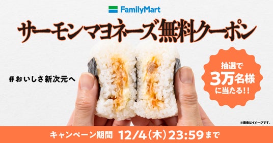 ファミリーマート公式Xアカウント(@famima_now)では、「#おいしさ新次元へ 直巻サーモンマヨネーズおむすびが抽選で3万人に当たるキャンペーン」として、直巻サーモンマヨネーズおむすびの無料引換券を、抽選で3万名様にプレゼントいたします。