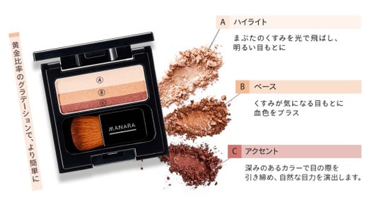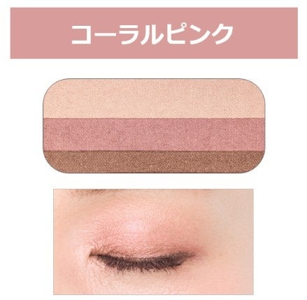 POINT2:大人の目もとを明るく華やかに彩る絶妙な色合い大人の気になる肌のくすみを計算して、明るく華やかな目もとを演出する色みを採用しました。中央のカラーは、目もとに血色感をプラスして生き生きと健康的な印象を演出します。