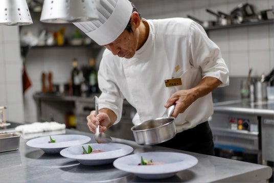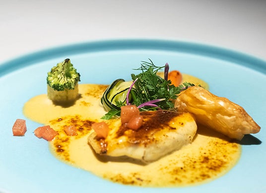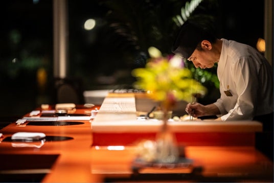 オリエンタルヒルズ沖縄には、フレンチ・江戸前鮨・鉄板焼きの3ジャンルを担う料理長が常駐しており、全14棟のスイートヴィラに滞在されるお客様のために、それぞれが長年培ってきた技と感性を生かした料理をご提供しています。