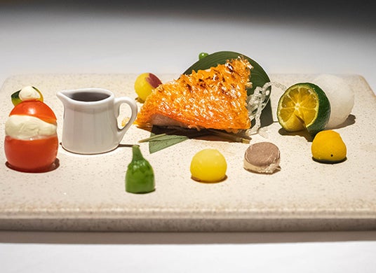 本コースでは、沖縄の海と大地が育んだ旬の恵みを、フレンチ・鮨・鉄板焼きの3つのジャンルの最適な調理法で仕立てた、一夜限りの特別フルコース(全7品)をご提供します。料理長が選び抜いた食材は、その日の状態や季節の移ろいに合わせて最も美味しく感じられるよう丁寧に仕立て、前菜からメイン、デザートまでを通して、“沖縄の旬”をお楽しみいただける構成としました。