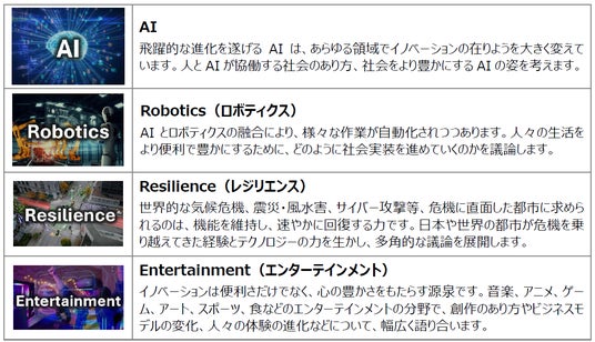 - 都市の未来を構想・議論する SusHi Tech Tokyoでは、毎年、イノベーションにより社会や人々の暮らしに大きな変革をもたらす領域にフォーカスすることで、サステナブルな都市を実現するテクノロジーについて議論を深めていきます。- SusHi Tech Tokyo 2026は、「AI」を基軸として、人々の暮らしを支える「Robotics(ロボティクス)」、「Resilience(レジリエンス)」、「Entertainment(エンターテインメント)」の4つにフォーカスし、セッション・展示・デモ等をパッケージで展開していきます。