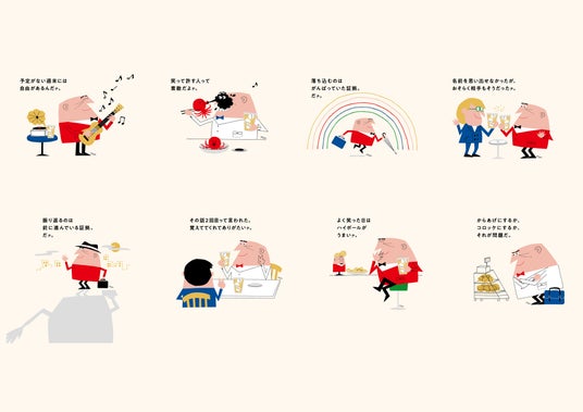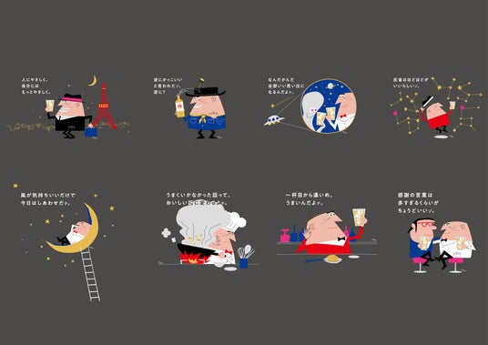 パッケージは、「アンクルトリス」のイラストを大きく配し、より親しみやすいデザインを目指しました。また、「トリスハイボール缶」「トリスハイボール缶〈美味しい濃いめ〉」の350ml缶、500ml缶それぞれの表・裏に、気持ちが和むような16種類の「アンクルトリス」の一言メッセージをあしらいました。