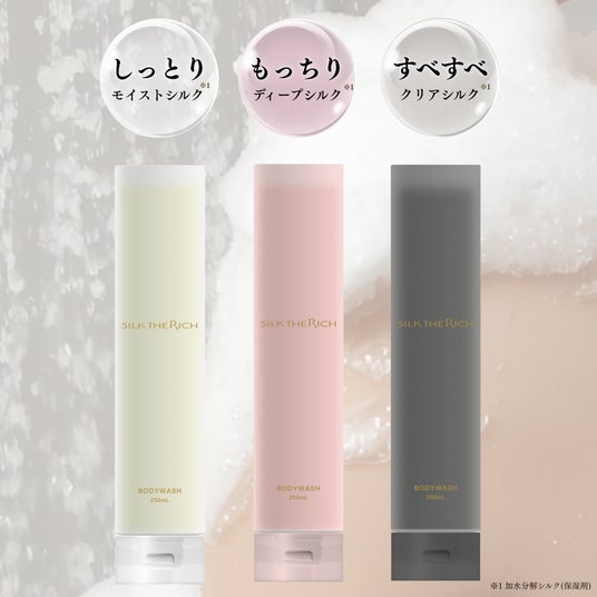 世界初※2の高浸透※3ナノ化シルク※4をはじめとしたこだわり成分配合で、洗う度にうるおいをまとう贅沢シルキーベールボディウォッシュ。白の「ザ・リッチ モイストシルキー ボディウォッシュ」はキメ細かい肌を目指したい方、黒の「ザ・リッチ クリアシルキー ボディウォッシュ」は毛穴や皮脂の汚れが気になる方、ピンクの「ザ・リッチ ディープシルキー ボディウォッシュ」は潤いのある、もっちり肌にしたい方と、肌の悩みや好みの仕上がり・香りでお選びいただけます。