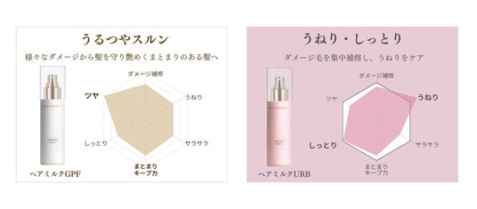 白の「ザ・リッチ ヘアミルク GPF」は艶めき指通りの良い「うるつやスルン髪」に、ピンクの「ザ・リッチ ヘアミルク URB」はうねりをケアし扱いやすくしっとりまとまる「ぷるツヤ髪」に導きます。とろりとしたテクスチャーは髪への摩擦を押さえ、翌朝も扱いやすい素直な髪へ。