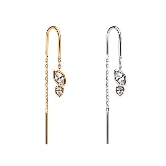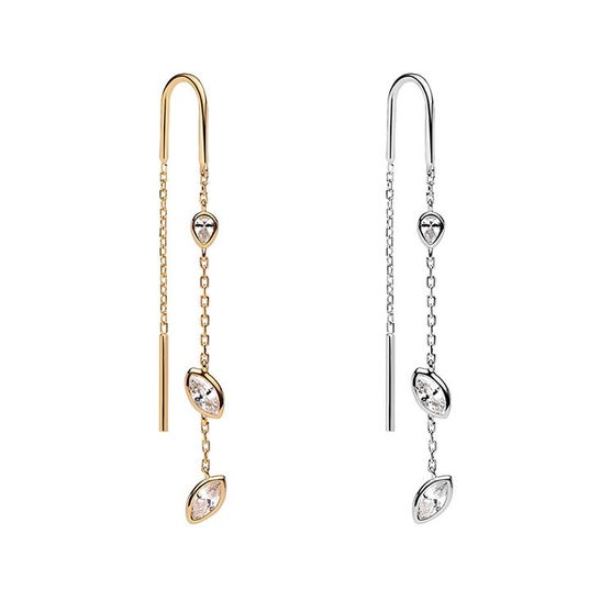 縦のラインが際立つ、軽やかに揺れるシルエットが印象的なピアス。動くたびに光を受けて上品な輝きを放ちます。軽やかさと存在感を兼ね備え、耳元をすっきりと見せるデザイン。左から)SWIFT EARRING GOLD(SV925、18Kイエローゴールドプレート・ジルコニア)13,200円、SILVER(SV925、ロジウムコーティング・ジルコニア)11,000円