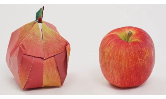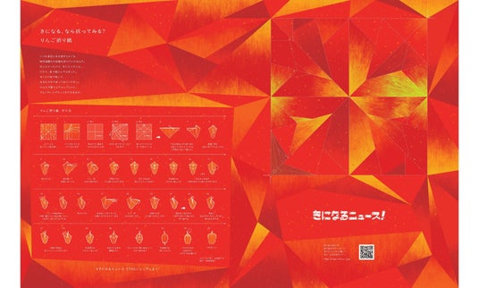 11月26日付信濃毎日新聞紙面に「りんご折り紙」を掲載します。暖色の幾何学模様のページをキリトリ線に沿って切り、折り方イラストの手順に沿って折っていただくと、なんと!りんごができ上がります!