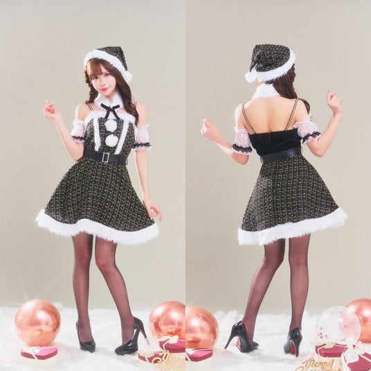 上品なブラックツイードを基調にした、大人っぽいシックな印象のサンタコスチューム。肩紐のパールとファーの付け襟が、ゴージャスで洗練された雰囲気を演出します。