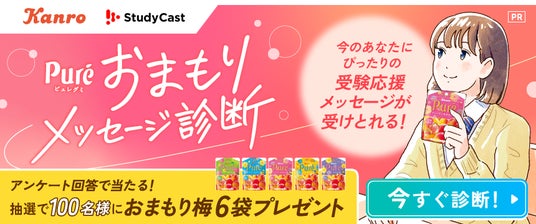 ベネッセコーポレーションが運営する中高生向けの学習管理アプリ「StudyCast(スタディキャスト)」で「ピュレグミおまもりメッセージ診断」を公開します。設問を通じて受験生の今の気分を診断し、気分に合った前向きになれるメッセージで、勉強に取り組む気持ちをそっと後押しします。また、アンケートにお答え頂いた方の中から抽選で合計100名様に「ピュレグミおまもり梅」6袋をプレゼントいたします。