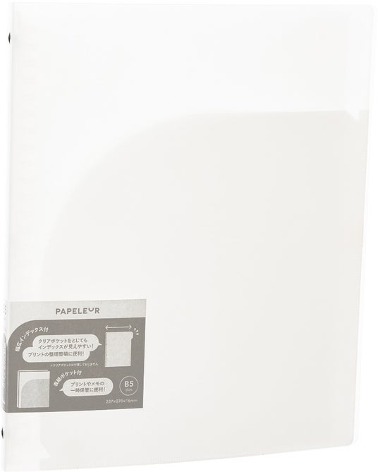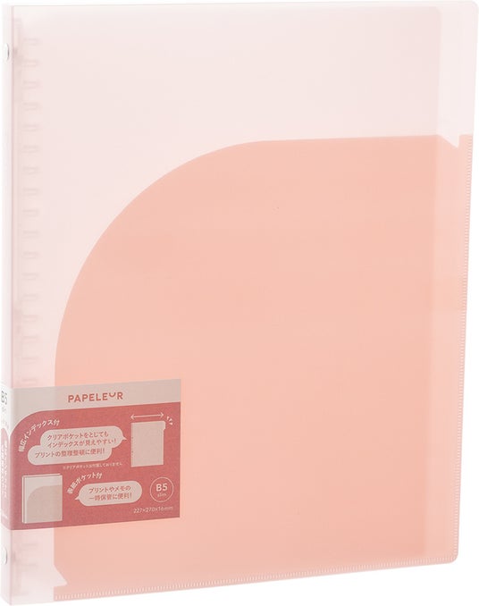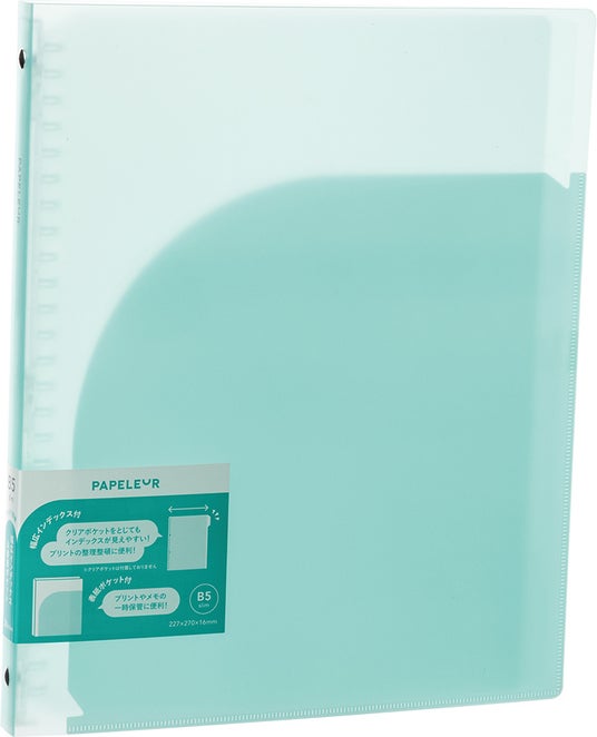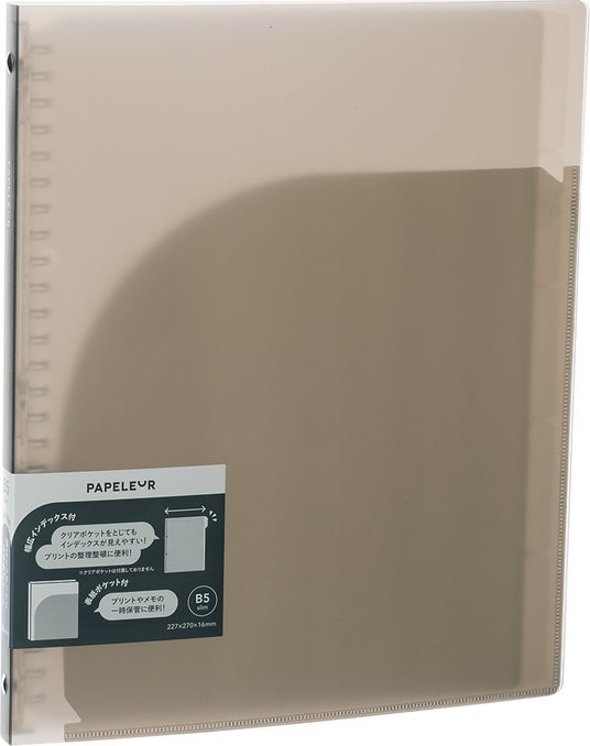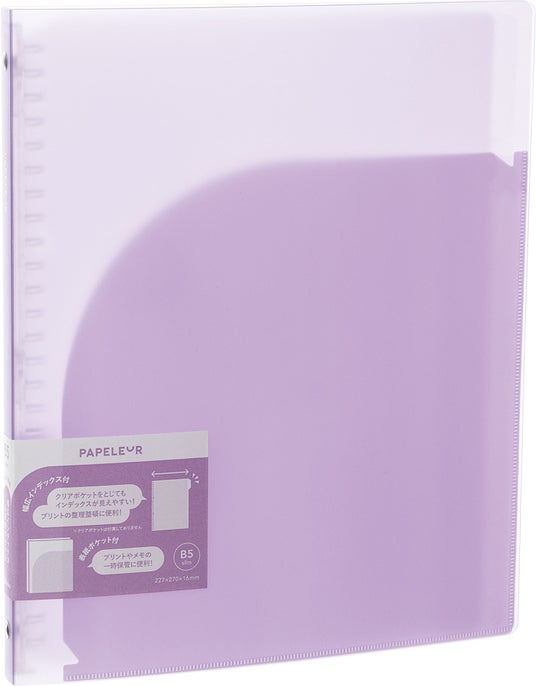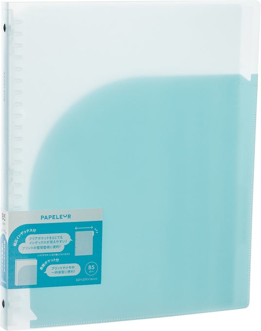 通常のインデックスより横が長い"幅広インデックス"5枚付きで、市販のクリアポケットをとじても見出しが隠れずに見えやすい仕様です。