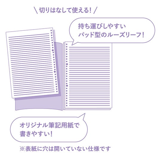 ルーズリーフの1辺が糊綴じになっているので、バラバラにならずに保管でき、使う時に必要分だけ切りはなして使うことができます。