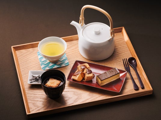 三種類の甘味と緑茶がセットになった御膳。お茶との相性をお楽しみください。