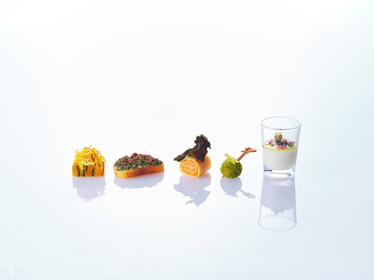 左から「パンプキンブレッセ」、「トリュフオーブンサンドイッチ」、「サステナブルサーモンクレープ」、「ズワイガニとポルチーニクリーム」、「アキテーヌ産キャビア」