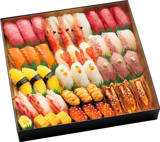 本マグロ中トロ、サーモン、天草産真鯛湯引き、国産天然ふぐ、北海道産和牛ローストビーフ、いくら軍艦、大牡丹海老、特上炙り穴子、まぐろ、いか、北海道産タラバガニ、数の子、無添加うに軍艦、厚焼玉子