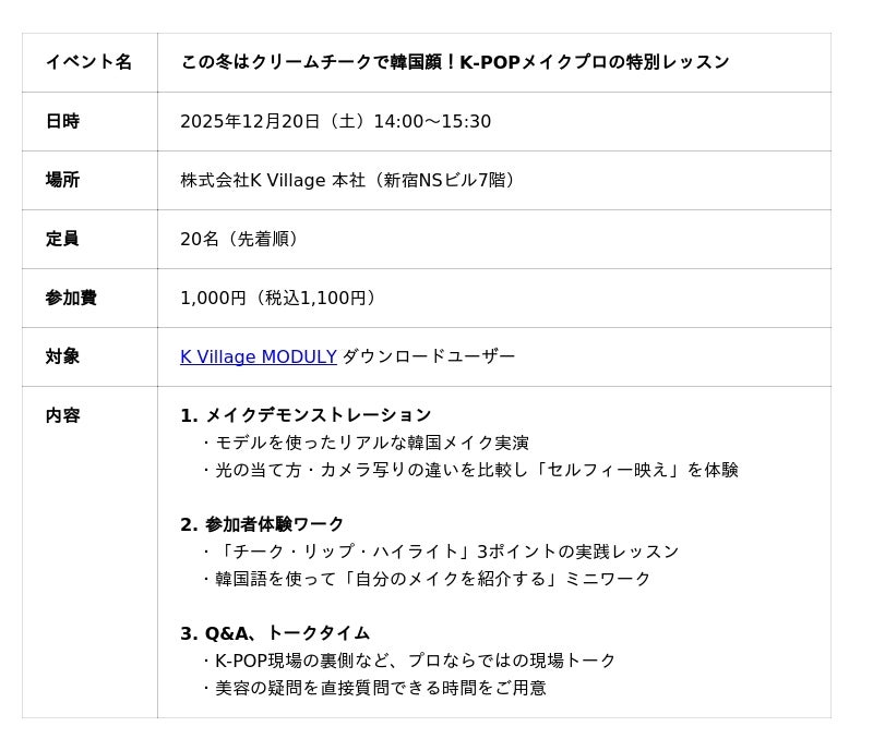 日本最大級の韓国語教室「K Village 韓国語」を運営する株式会社K Village(本社:東京都新宿区、代表取締役社長:桑原 元就)は、2025年12月20日(土)、韓国情報アプリK Village MODULYと連動した特別イベント【この冬はクリームチークで韓国顔!K-POPメイクプロの特別レッスン】を開催します。