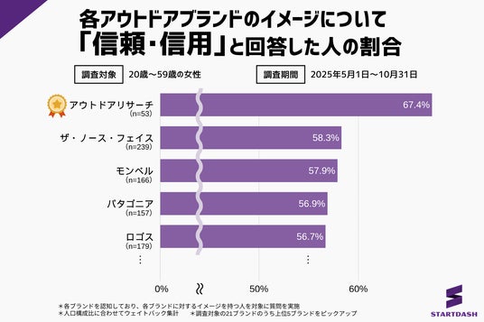・「信頼・信用」は、認知率15.2%の『アウトドアリサーチ』が67.4%でトップ評価