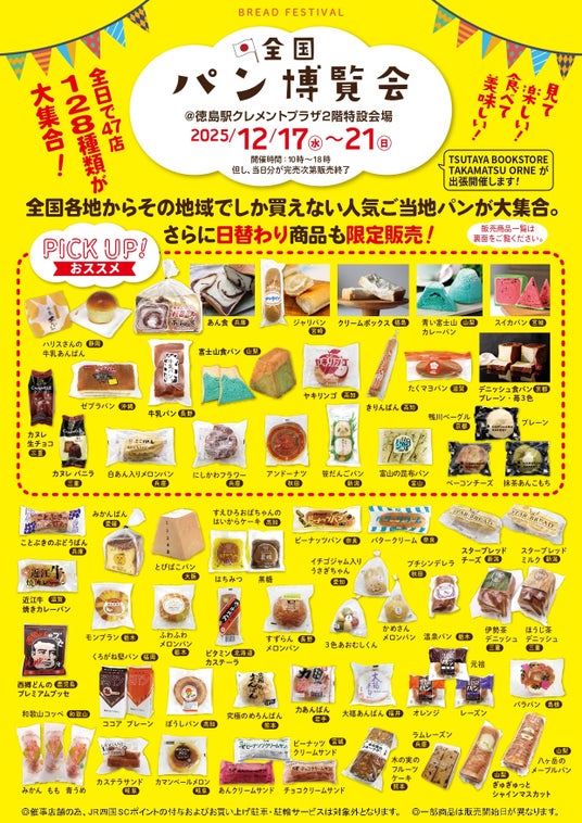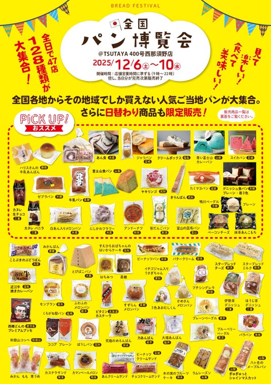 カルチュア・エクスペリエンス株式会社(本社:東京都千代田区、代表取締役社長:鎌浦 慎一郎)は、全国のご当地パンを集めたイベント『全国パン博覧会』を各地で開催しています。12月は、「TSUTAYA いまじん白揚瀬戸店」(愛知県瀬戸市)、「TSUTAYA 400号西那須野店」(栃木県那須塩原市)、「TSUTAYA いまじん白揚ミタス伊勢店」(三重県伊勢市)、「幕張 蔦屋書店」(千葉県千葉市)、「TSUTAYA いまじん白揚ウイングタウン岡崎店」(愛知県岡崎市)、「TSUTAYA BOOKSTOREカラフルタウン岐阜」(岐阜県岐阜市)、「徳島駅クレメントプラザ(TSUTAYA BOOKSTORE TAKAMATSU ORNE出張開催)」(徳島県徳島市)で、12月3日(水)より順次開催いたします。