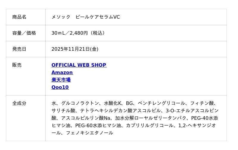 ブランド第一弾アイテムとなる「メソック ピールケアセラムVC」は、3種のピールケア成分※2を20%※1以上配合。ザラつき、毛穴※4、角質、くすみ※4、皮脂などが気になる肌をケアします。また、浸透力※5にこだわった3種のビタミンC誘導体※3を配合。肌をすこやかに保ち、透明感※6のある肌印象をサポートします。