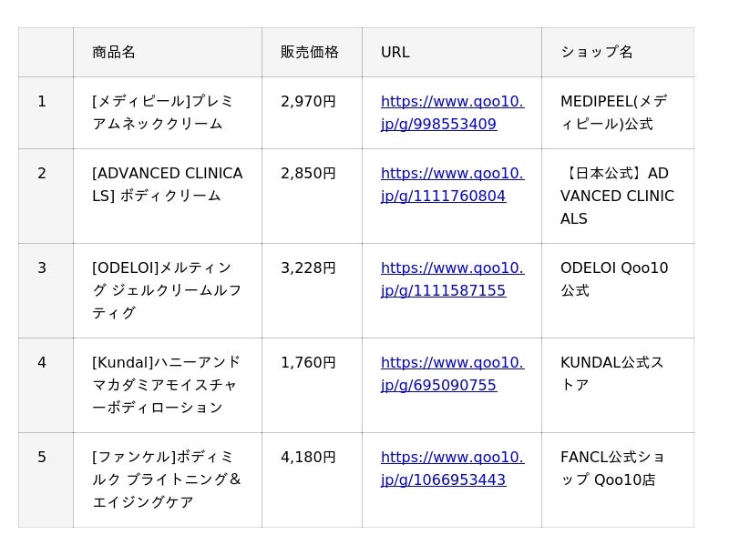 Qoo10(https://www.qoo10.jp/)サイト上、「ボディクリーム・ローション」「リップメイク」「アイシャドウ」「チーク」カテゴリーの公式ショップ各販売個数に基づいたランキングです。