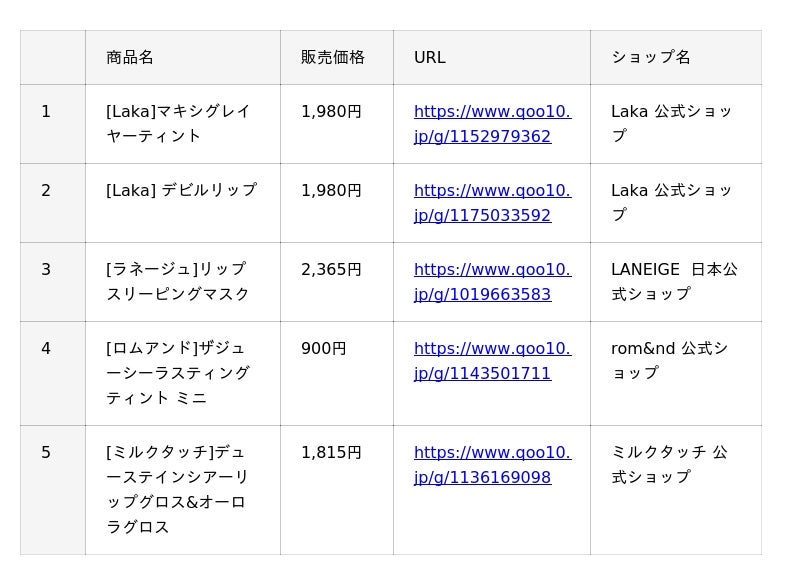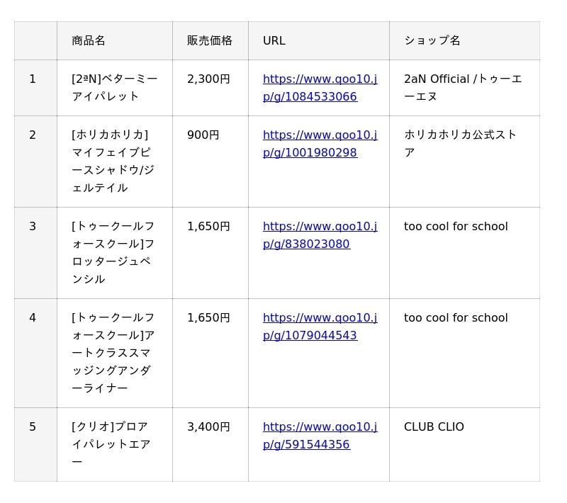 インターネット総合ショッピングモール「Qoo10」を運営するeBay Japan合同会社(本社:東京都港区、代表取締役:グ ジャヒョン)は、Qoo10で人気のコスメカテゴリーの中から、『リップ』『アイシャドウ』『チーク』と、月替わりで1アイテムをピックアップした、月間販売数TOP5※をご紹介していきます。