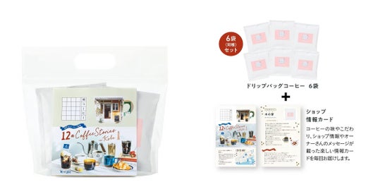 ドリップバッグコーヒー6袋とともに、ショップ情報とオーナーさんからのコーヒーに込めたメッセージをお届けし、カフェを訪れてオーナーさんと会話したような気分をお届け