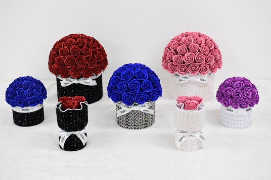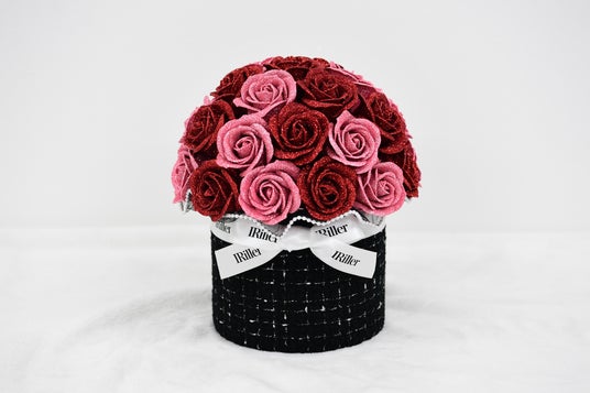 バラ一輪一輪の色合いや輝きが最も美しく見えるよう、ドーム状に整える独自構造を採用。ベース部分には 尾州産ツイード生地を巻いたオリジナル設計 を組み合わせ、サイズや角度まで細部を検証することで、360度どこから見ても均整のとれた曲線美を実現しています。