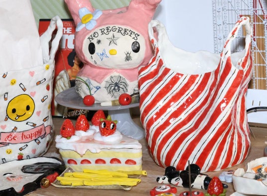 彼女のマルチメディア作品の原点には幼少期の体験があり、特に商業看板のペインターとして腕を磨いていた父の影響を強く受けました。以来、セラミック、ウッドバーニング(焼き描き)、絵画、ジュエリー、テキスタイル、版画、イラストレーションなど、多彩な素材や技法に挑戦しています。