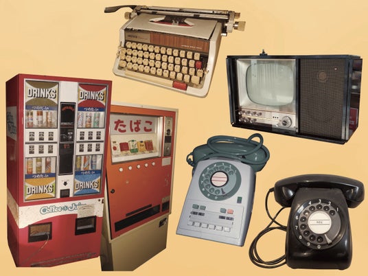 ジュースやタバコの小型自販機、琺瑯(ホーロー)看板、タイガー計算機など、今では見られない昭和の実物アイテムを展示。
