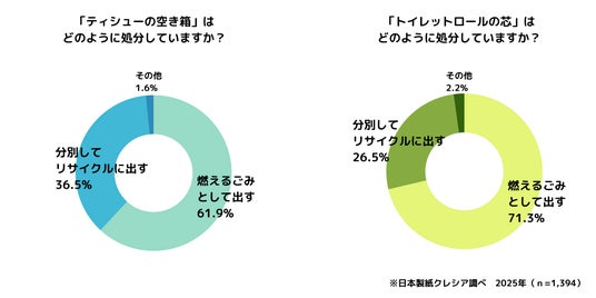 ・トイレットロールの芯:「燃えるゴミとして処分」は71.3%、「分別してリサイクル」は26.5%