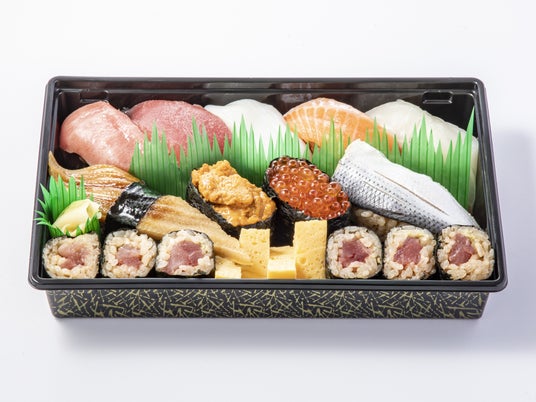 近畿大学生まれの完全養殖の稚魚から育った鮮魚をふんだんに使用しています。紅色は「近大生まれのマグロ」、白色は「近大生まれのマダイ」「近大生まれのシマアジ」を使用し、食材でおめでたい紅白を演出したお弁当です。