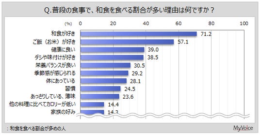 和食を食べる割合が多い人に、多い理由を聞いたところ(複数回答)、「和食が好き」が71.2%、「ご飯(お米)が好き」が57.1%、「健康に良い」「ダシや味付けが好き」が各4割弱です。