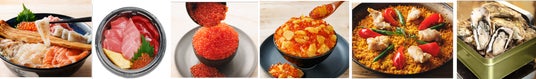 マグロ、サーモン、カニ、イクラ、カキ、ホタテなどの旬で新鮮な魚介が大集合。海鮮丼や漁師飯、郷土料理、鍋料理、海鮮ラーメン、海鮮パエリアなど和洋中のメニューが勢ぞろい。