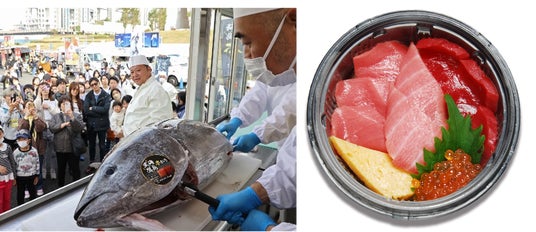 「豊洲かんぺい会」が日比谷に帰ってきます。長崎・鷹島から直送した「生本マグロ」を来場者の目の前で解体。さばいたばかりの超新鮮なマグロの赤身、中トロ、大トロを思う存分に食べ比べられる「大とろ入本まぐろ三色丼」などを提供します。