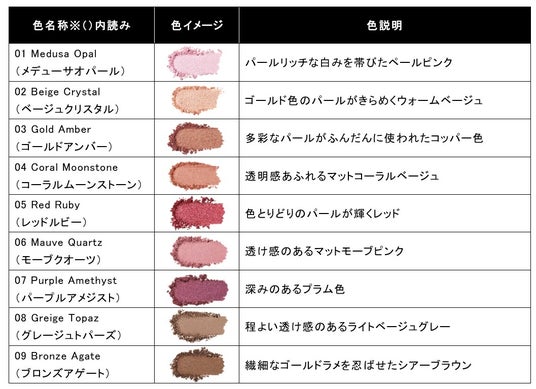 多彩なカラーと輝きで、肌と調和し美しさを引き立てる天然石インスピレーションを受けた全9色展開。ハイライター、チーク、アイシャドウ、シェーディングなど幅広く使用可能なマルチユースカラー。