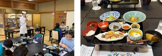 市内の飲食店の中でも歴史のある「料亭・能登新」を訪れ、ワークショップの為に作られた鮭の特別メニューを食しました。皮や骨、肝など、鮭の部位を余すことなく利用した数々の料理。腕を振るった山貝誠料理長からは料理の説明のほか、海の貴重な資源である鮭の有難さについて話して頂きました。子どもたちは一口一口味わいながら、学びを味覚でも体験していました。