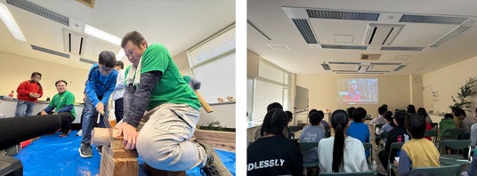 午後は朝日地区公民館に移動して、森林の保全活動や木育活動をしている「次世代の集い」のメンバーと合流。海洋環境に恩恵をもたらす森や川の役割について「次世代の集い」東海林直仁さんから講演がありました。森林の地中の栄養分が川を通して海に供給されることを学び、海・川・森の自然体系の繋がりへの理解を深めました。また子どもたちは、サポートを受けながらノコギリを用いて木材加工に挑戦。オリジナルのペン立てを製作しました。市内で伐採された木材に実際に触れることで、海に恩恵をもたらす森林の重要性について理解を促す機会となりました。