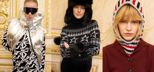 Perfect Moment H&M:<左> ポラライズドサングラス ¥9,999、ウォーターリペレント ダウンベスト ¥16,999、プリントハイネックトップス ¥6,999、プリントレギンス ¥6,999 <中央> トラッパーハット ¥6,999、メリノウールブレンド ジャカードニットセーター ¥9,999 <右> ウールリブニットバラクラバ ¥6,999、ウールブレンドトップス ¥9,999