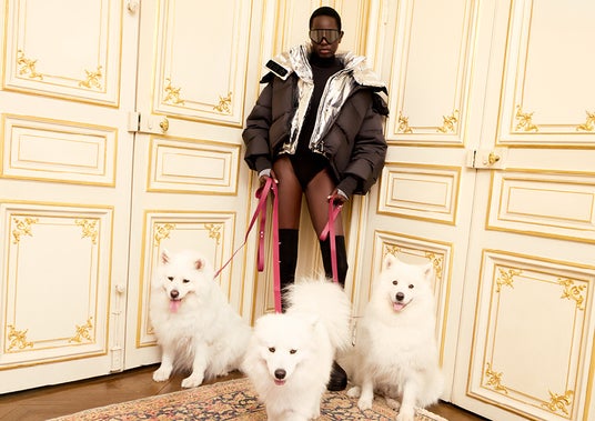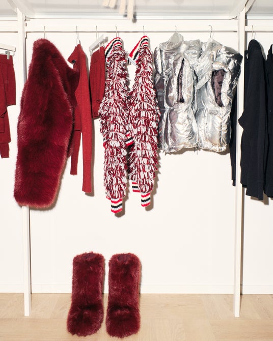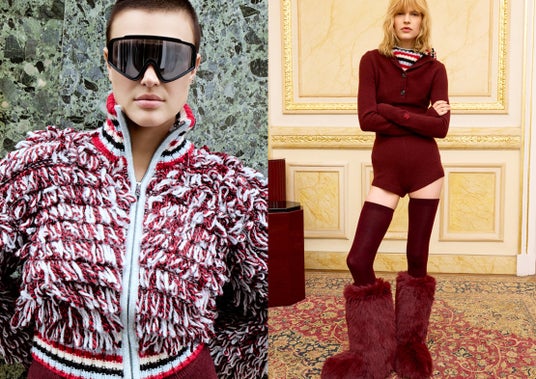 キーアイテムには個性的で華やかなアウター類が揃い、クロップド丈でフードがポイントのバーガンディのフェイクファー×ダウンパファージャケット、ジャカードベルト付きのブラック×ホワイトのスター柄パファージャケットが登場。ボトムスのバーガンディのレザートラウザーはスキーパンツをベースにし、控えめなブーツカットとふくらはぎ部分のジップがアクセントとなっています。