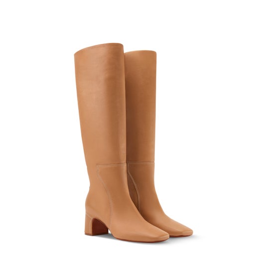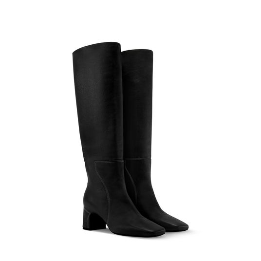 スクエアトウとブロックヒールが印象的な、ルイ・ヴィトン 2026クルーズ・コレクションを象徴する「アヴァロン ハイブーツ」。しなやかなグレインカーフレザーで仕立て、チューブラー製法の構造を引き立てました。プルオン仕様のデザインで、バックに施したループ状のモノグラム・キャンバスのトリミングもアクセントになっています。