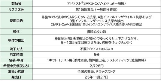 ヘルスケア価値の提供を通じて社会に貢献するシオノギヘルスケア株式会社(本社:大阪府大阪市、代表取締役社長:中川 ゆう子、以下、シオノギヘルスケア)は、この度、新型コロナウイルス、インフルエンザ(A型・B型)感染症の一般用抗原検査キット(OTC)「アドテスト(R)SARS-CoV-2/Flu(一般用)」(以下、本キット)を11月27日より発売いたします。