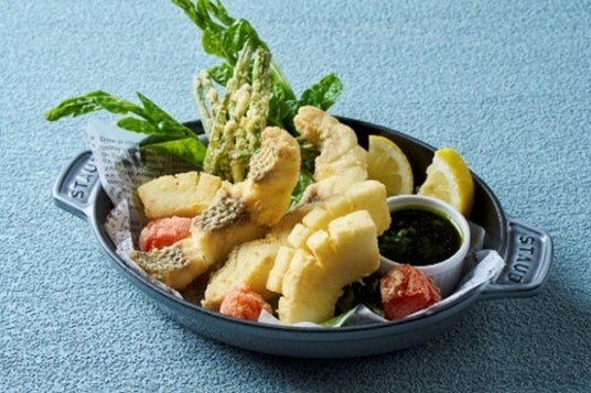 概要|伊江島で水揚げされたタマン(ハマフエフキ)やソデイカ、島ラッキョウに沖縄県産野菜を合わせたフリットです。素材それぞれの食感と香ばしさが引き立つ、彩り豊かな一皿です。
